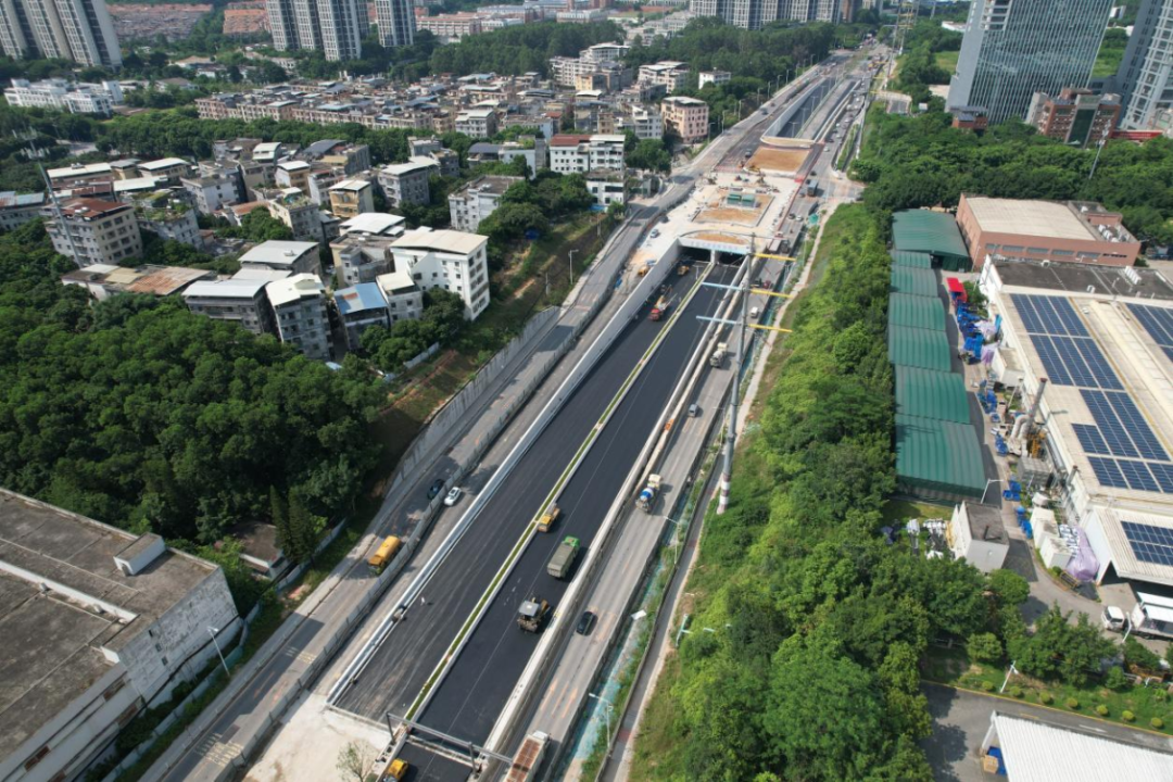 开放大道九岭路隧道节点是开放大道北二期项目的三大节点之一,九岭路隧道的通车,打通了开放大道的最后一环,意味着黄埔开放大道这条城市主动脉全线贯通!