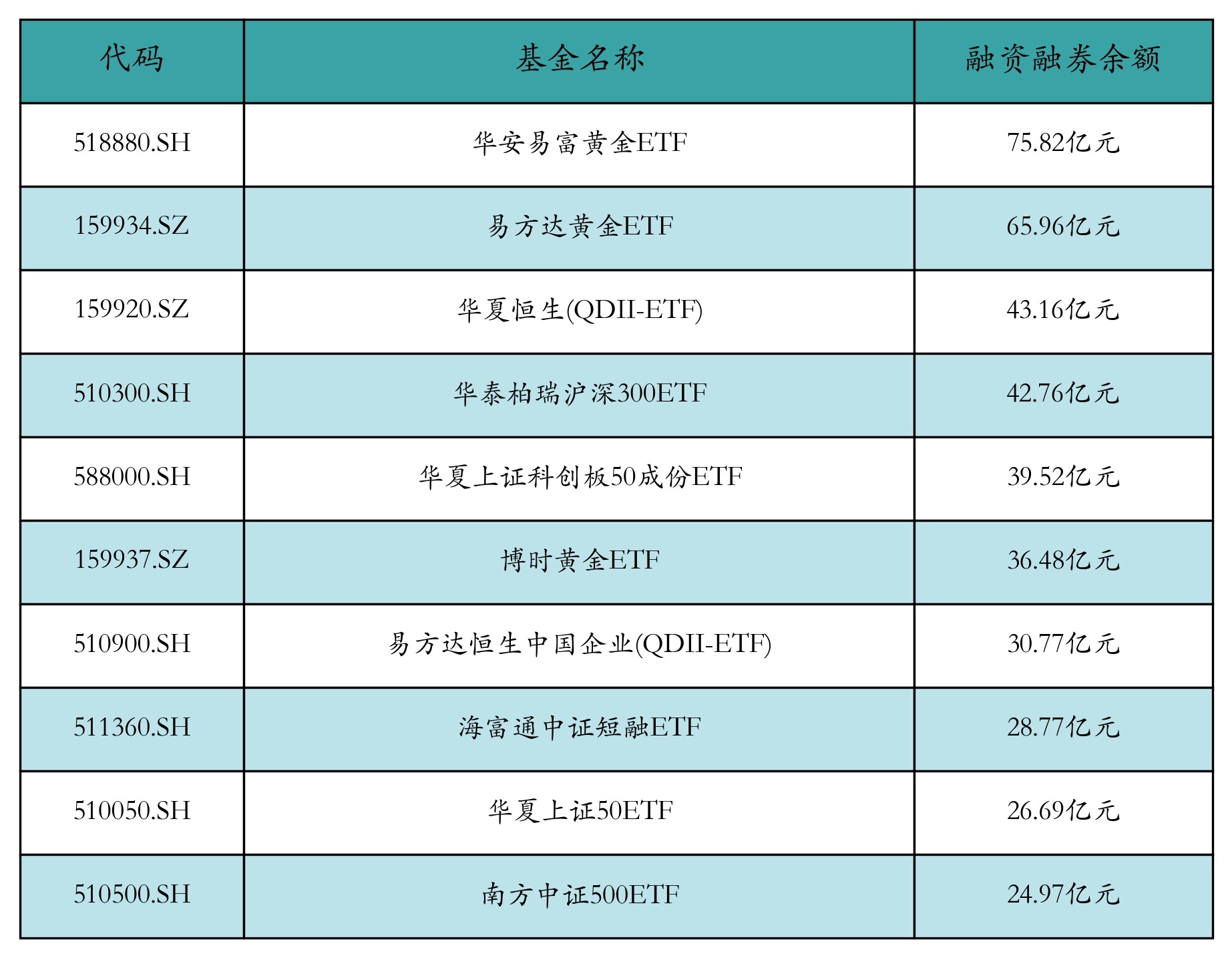 7月28日ETF两融余额前三位分别为:华安易富黄金ETF(75.82亿元)、易方达黄金ETF(65.96亿元)和华夏恒生(QDII-ETF)(43.16亿元),前10具体见下表: