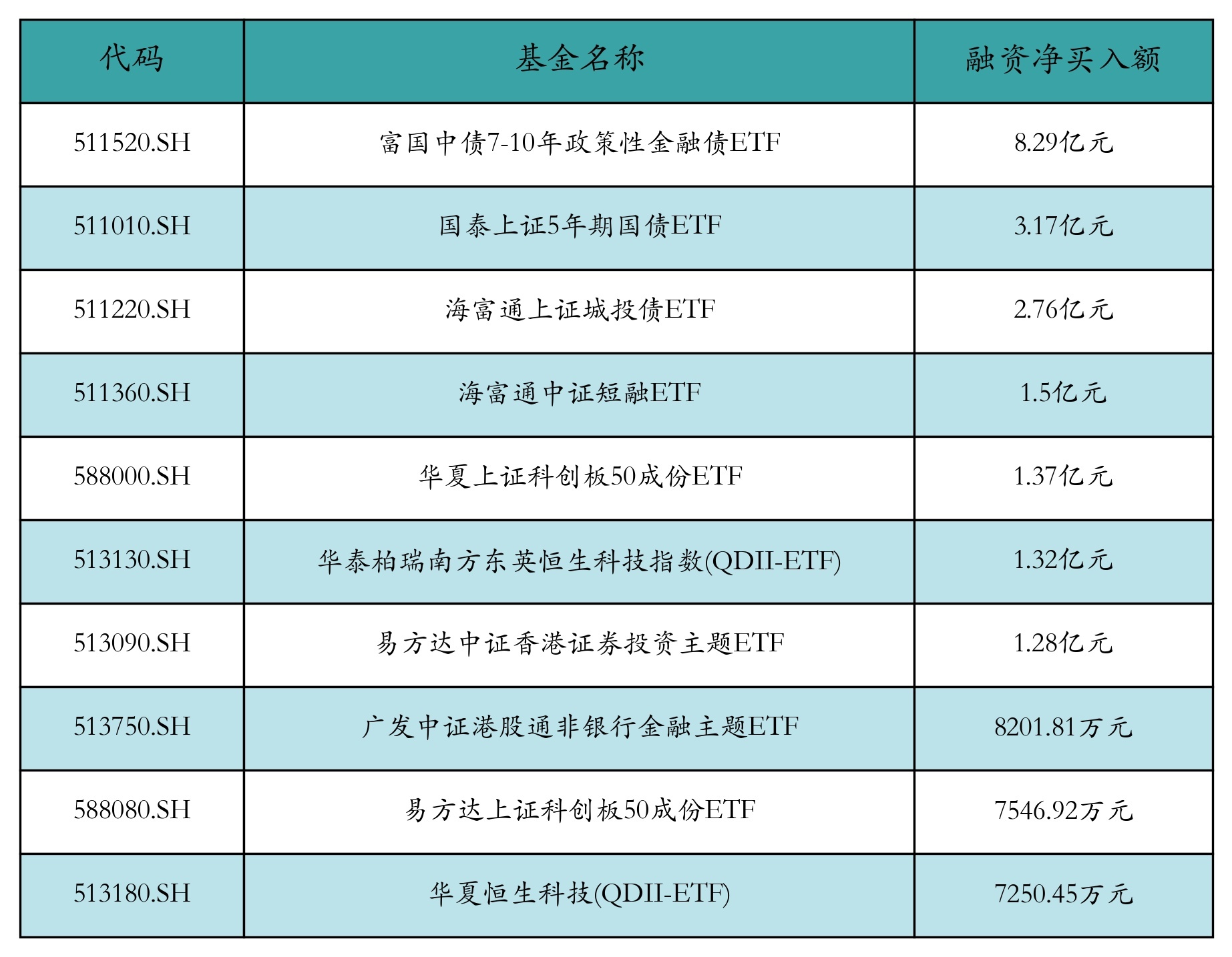 7月28日ETF融资净买入额前三位分别为:富国中债7-10年政策性金融债ETF(8.29亿元)、国泰上证5年期国债ETF(3.17亿元)和海富通上证城投债ETF(2.76亿元),前10具体见下表:
