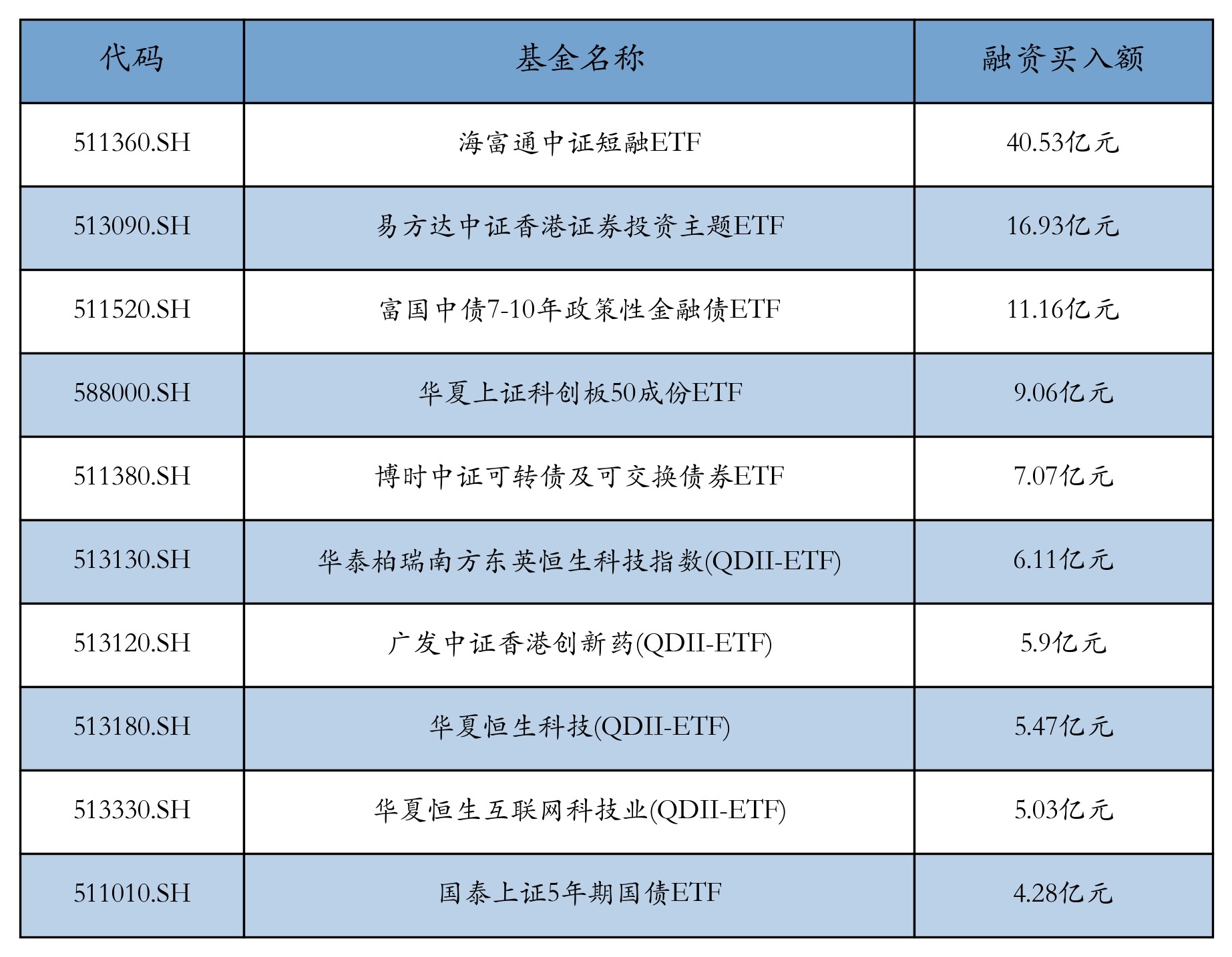 7月28日ETF融资买入额前三位分别为:海富通中证短融ETF(40.53亿元)、易方达中证香港证券投资主题ETF(16.93亿元)和富国中债7-10年政策性金融债ETF(11.16亿元),前10具体见下表: