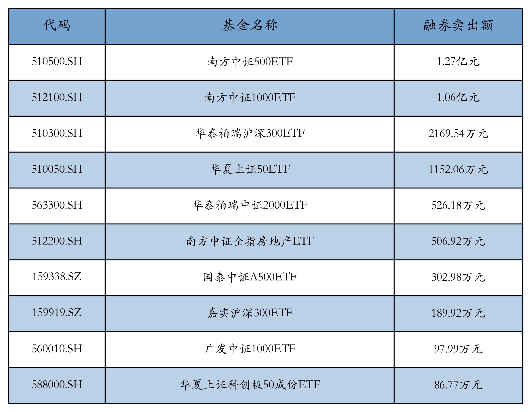 7月28日ETF融券卖出额前三位分别为:南方中证500ETF(1.27亿元)、南方中证1000ETF(1.06亿元)和华泰柏瑞沪深300ETF(2169.54万元),前10具体见下表: