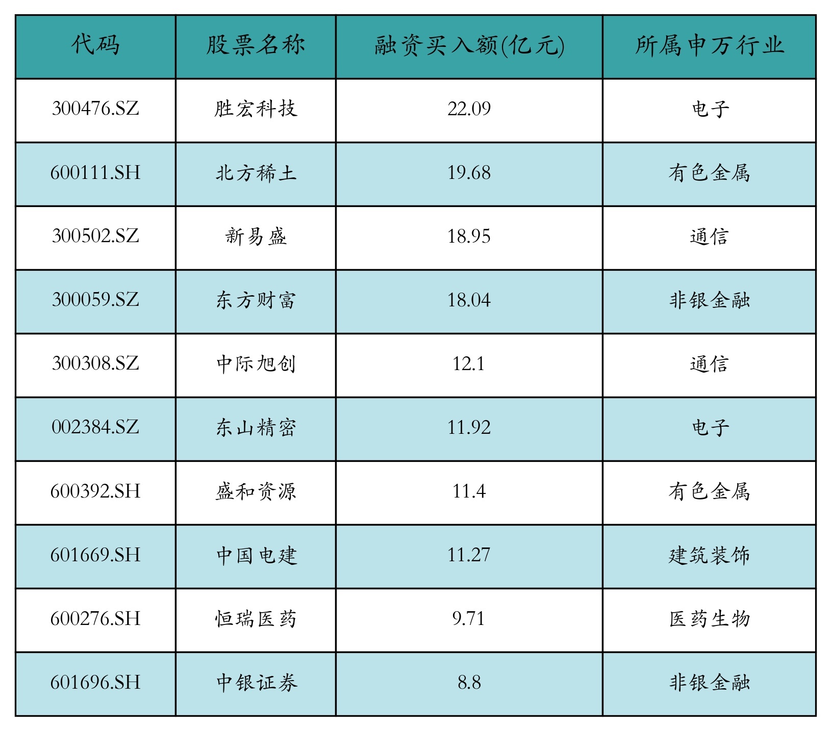 两市共有3443只个股有融资资金买入,其中胜宏科技、北方稀土、新易盛排名前三,买入金额分别22.09亿元、19.68亿元、18.95亿元。融资买入额前10个股详情见下表: