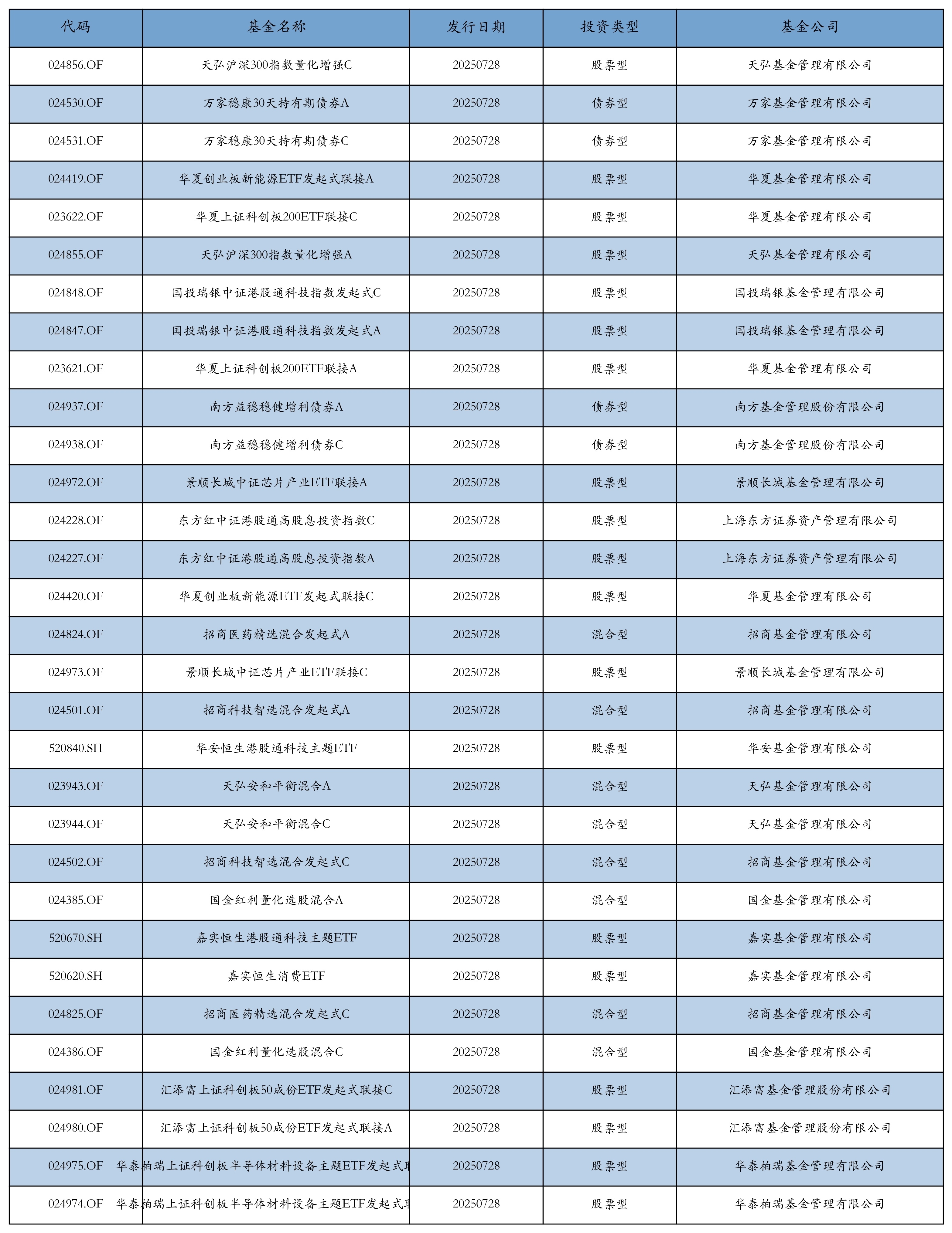 昨日有31只新基金发行分别为天弘沪深300指数量化增强C、万家稳康30天持有期债券A、万家稳康30天持有期债券C、华夏创业板新能源ETF发起式联接A、华夏上证科创板200ETF联接C、天弘沪深300指数量化增强A、国投瑞银中证港股通科技指数发起式C、国投瑞银中证港股通科技指数发起式A、华夏上证科创板200ETF联接A、南方益稳稳健增利债券A、南方益稳稳健增利债券C、景顺长城中证芯片产业ETF联接A、东方红中证港股通高股息投资指数C、东方红中证港股通高股息投资指数A、华夏创业板新能源ETF发起式联接C、招商医药精选混合发起式A、景顺长城中证芯片产业ETF联接C、招商科技智选混合发起式A、华安恒生港股通科技主题ETF、天弘安和平衡混合A、天弘安和平衡混合C、招商科技智选混合发起式C、国金红利量化选股混合A、嘉实恒生港股通科技主题ETF、嘉实恒生消费ETF、招商医药精选混合发起式C、国金红利量化选股混合C、汇添富上证科创板50成份ETF发起式联接C、汇添富上证科创板50成份ETF发起式联接A、华泰柏瑞上证科创板半导体材料设备主题ETF发起式联接C、华泰柏瑞上证科创板半导体材料设备主题ETF发起式联接A详情见下表: